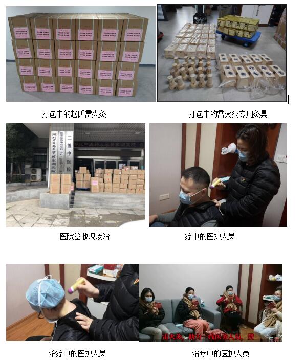 在这一严峻形势,重庆赵氏雷火灸传统医药研究所立即行动,制定了“关于赵氏雷火灸预防新冠肺炎的临床应用方案”、“赵氏雷火灸呼吸系统的应用”,并捐赠给:1、湖北省中医药大学方舱医院、2、武汉中心医院、3、武汉市洪山区中医医院,4、武汉市洪山区洪山街社区卫生服务中心、等4家医院。先后捐赠物资共计:雷火灸60箱,60双孔灸盒,60个单孔灸盒,40个网罩灸具,毛巾120余条,价值约39万元雷火灸产。同时献给治疗方案,并制作操作视频,指导一线医务人员使用,用中医灸疗方法治疗初期和恢复期新冠肺炎患者,以及一线医护人员自身预防治疗,以提高免疫力,缓解疲劳,达到预防和增强免疫力的功效。