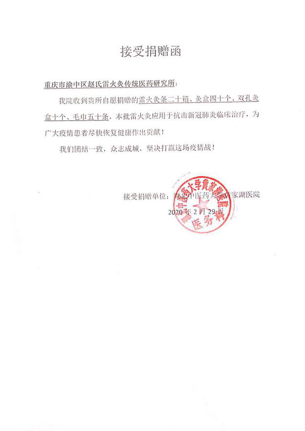 重庆市非物质文化遗产 赵氏雷火灸爱心捐献湖北