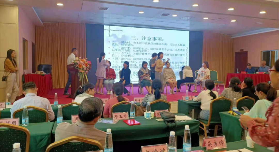 会上国家中医药管理局医政司特聘中医药适宜技术雷火灸疗法省级师资教师、重庆市渝中区,非物质文化遗产区级代表性传承人、赵氏雷火灸第五代传承人张丽老师参与此次授课。