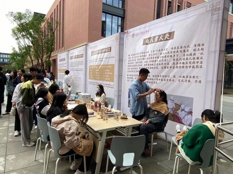 2023年10月19日,赵氏雷火灸作为传统医药类国家级非物质文化遗产受重庆中医药大学邀请,到校进行技艺讲解和现场展示、体验。对雷火灸的起源、创新技术、获批国家奖项、优势病种、科研课题等做了讲解,引起了广大学生的兴趣和关注。现场进行了干眼症、鼻炎、颈椎病、腰椎病等治疗,症状改善明显。被电视台进行采访,治疗效果得到了大家的认可和信任。并在中医药大学校内设立赵氏雷火灸体验区。