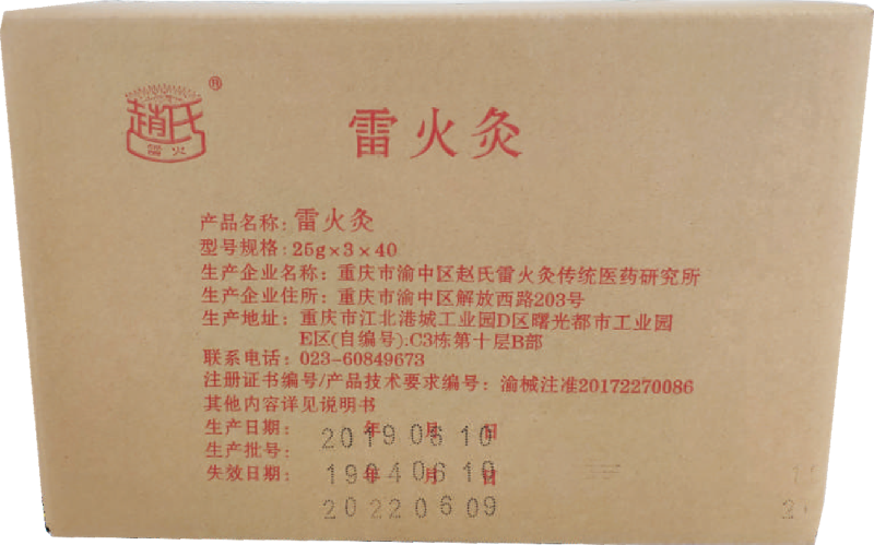 赵氏雷火灸产品为重庆市赵氏雷火灸传统医药研究所独家 传承、发明和研制,具有独特的理论基础、祖传秘制配方、手 法技术和灸疗经验,产品质量稳定,临床疗效安全可靠。
